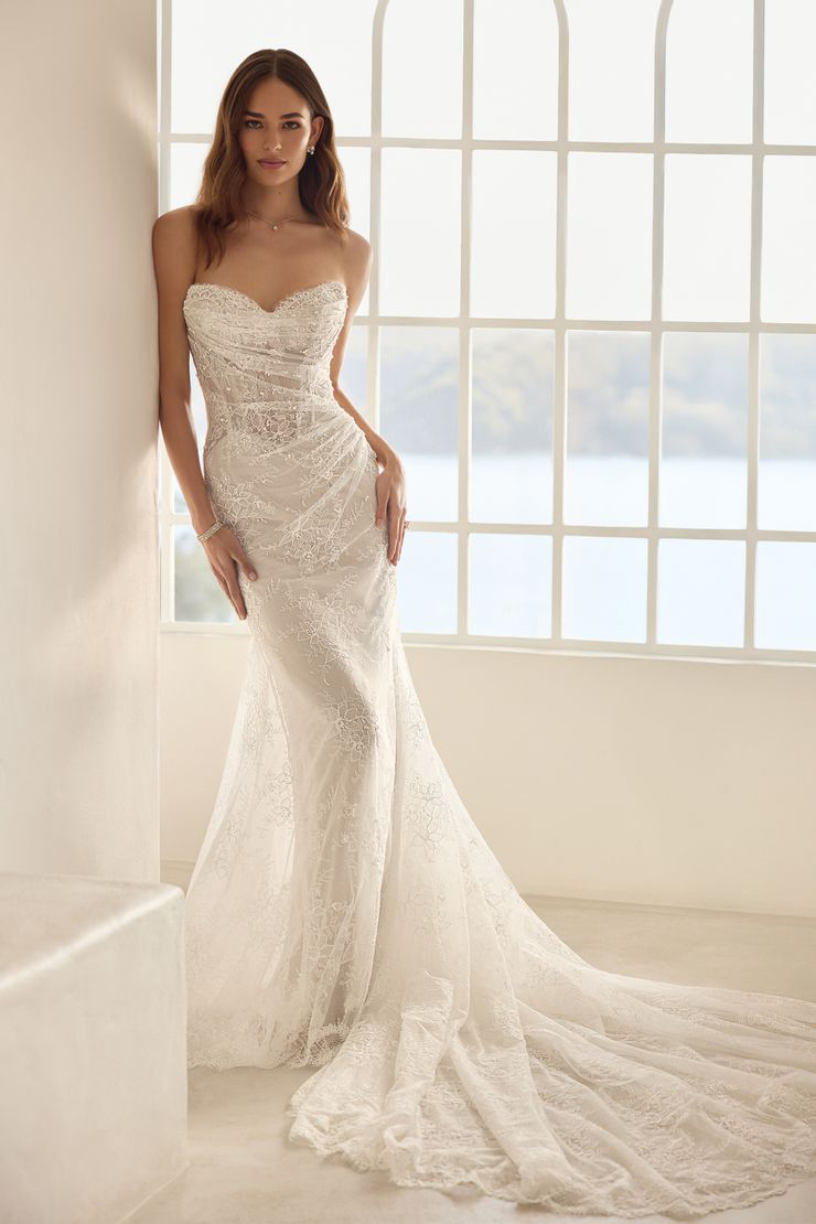 Strapless Overlace Wedding Dress With Pearls. Clancy commands attention from all with her shimmering details and effortless silhouette. The strapless sweetheart neckline is softened by draped overlace adorned with delicate pearls, while ruching at the back enhances the gown’s sculpted fit. Layers of glitter tulle and overlace create a fit-and-flare silhouette, glistening softly with every step – a blend of timeless romance and modern charm. Choose Clancy for an alluring walk down the aisle!
